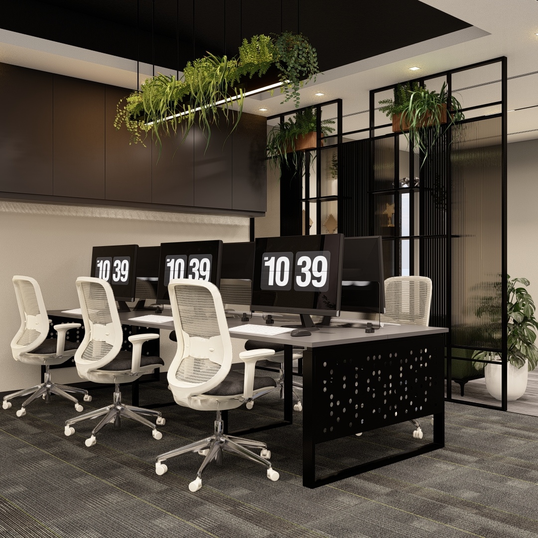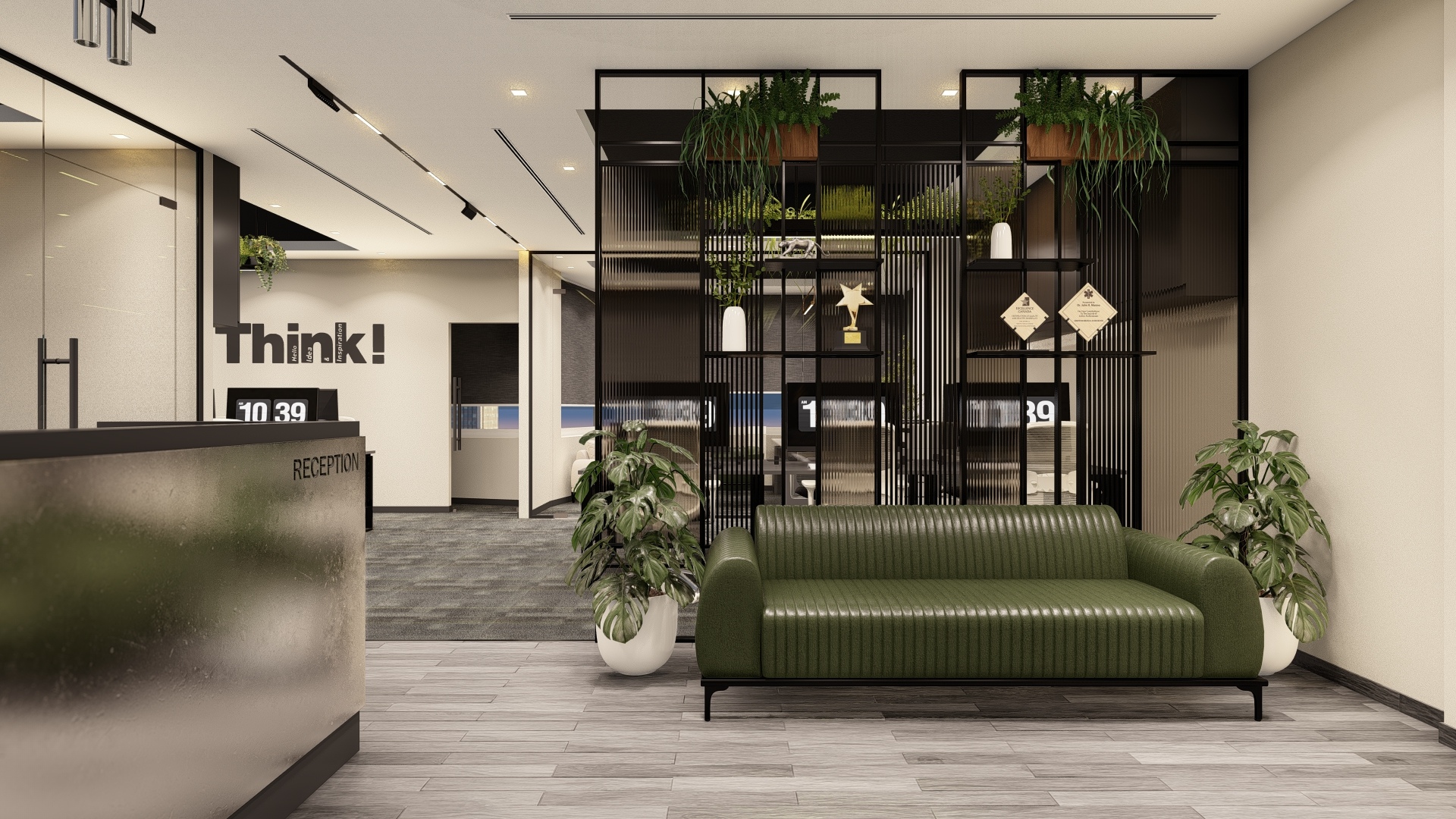 The Photon Matters office showcases a refined mix of olive green furniture, off-white walls, and cement-textured finishes, creating a calm and contemporary atmosphere. Black metal partitions introduce a bold industrial contrast, enhancing the space's structure and style. The overall design conveys balance and modern elegance, merging warmth with a professional tone that reflects the brand's innovative identity and commitment to functionality.y.